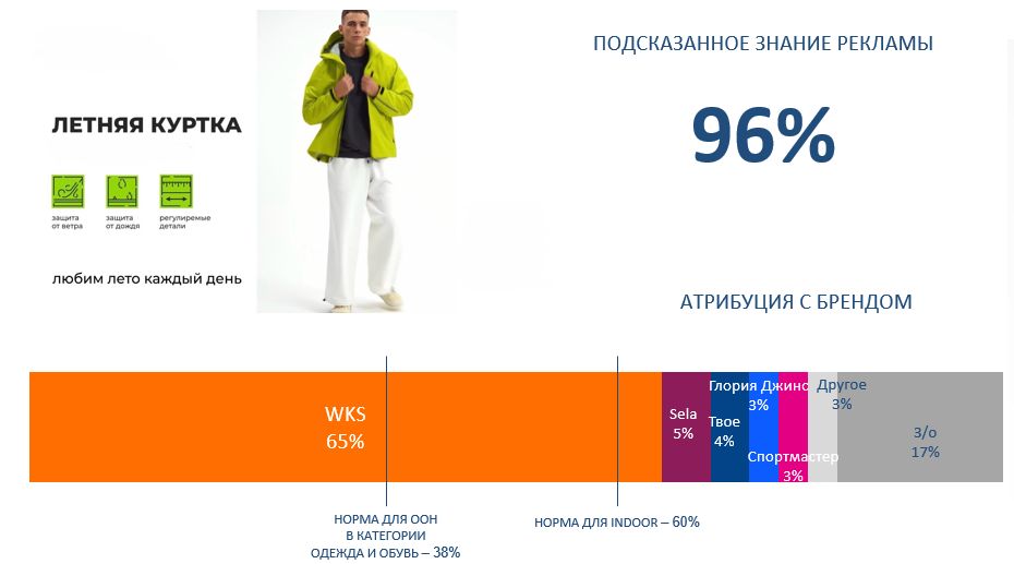Более того — 57% из тех, кто видел рекламу, заявили, что хотели бы носить одежду WKS. Для сравнения: в контрольной группе этот показатель почти в три раза ниже и составляет 20%.