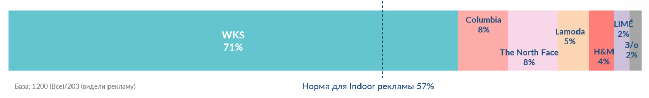 17% аудитории видели рекламу с креативом SPORT на стендах в подъездах, 71% из них правильно атрибутировали бренд, что заметно выше нормы для Indoor рекламы. Рекламу иногда путали с другими брендами верхней спортивной одежды.